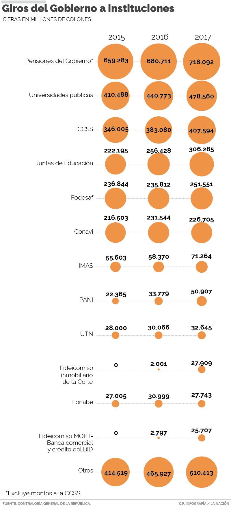 Entre el 2016 y el 2017, estos giros crecieron de ¢2,8 billones a ¢3,1 billones, es decir, casi un 10%. Se comen una tercera parte del Presupuesto Nacional (de ¢9,3 billones).