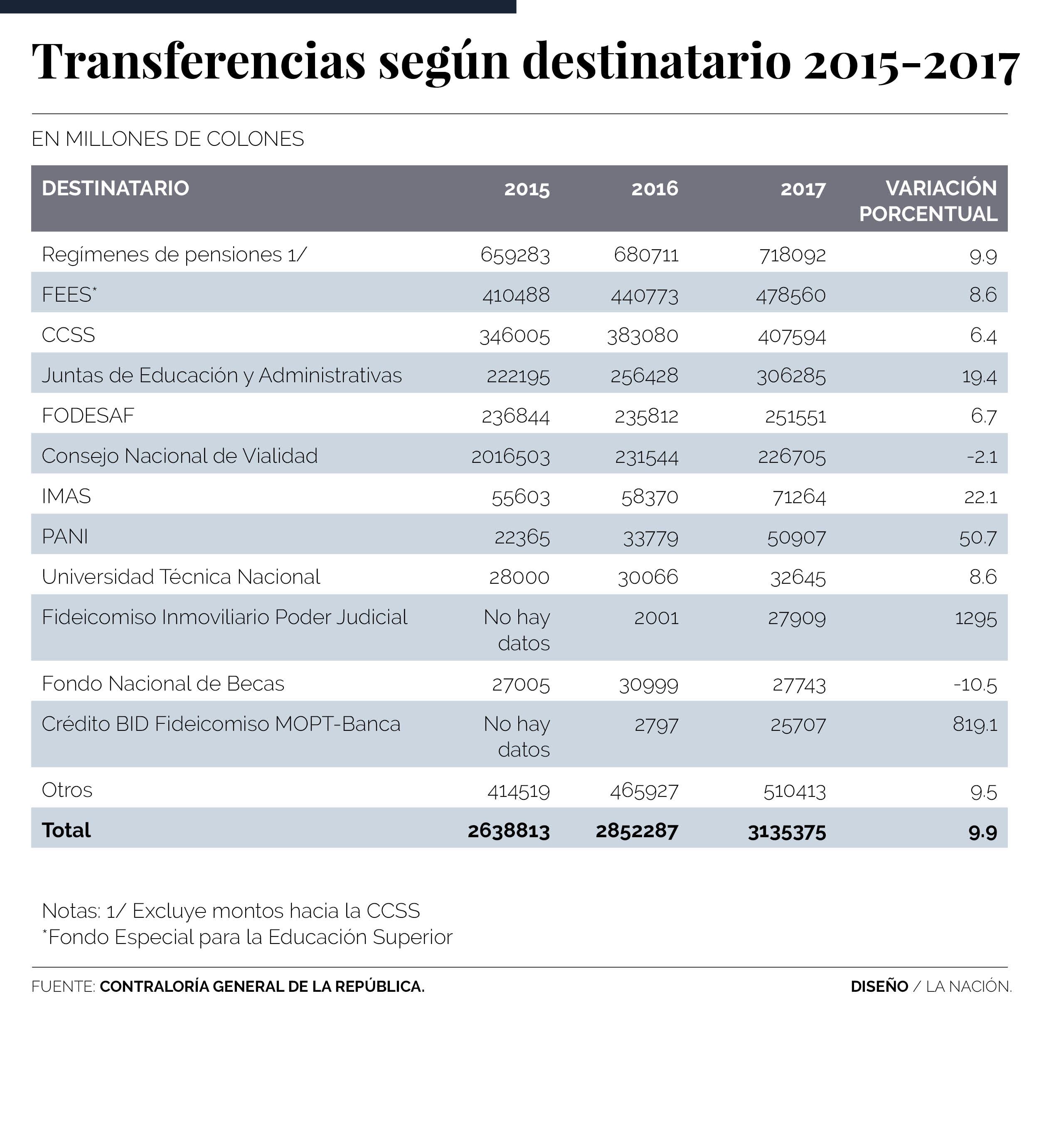 “Se tiene que las transferencias son el principal rubro de gasto del Gobierno, crecen a una tasa elevada y, en su mayoría, responden a destinos específicos de carácter legal o constitucional, no con base en las posibilidades de la hacienda pública ni de la capacidad ejecutora de la institución receptora", analizó la Contraloría General de la República sobre las transferencias en su Memoria Anual 2017.