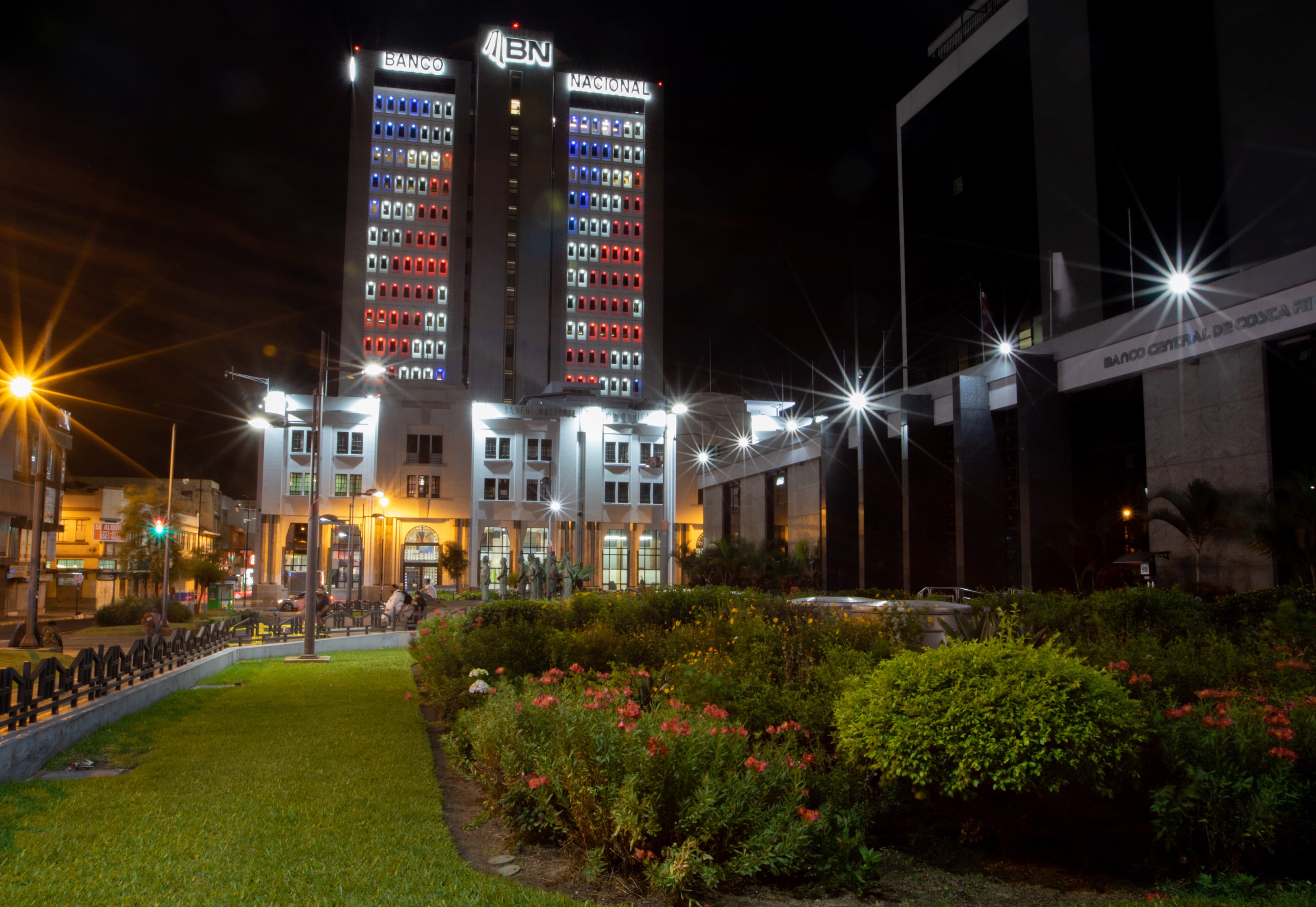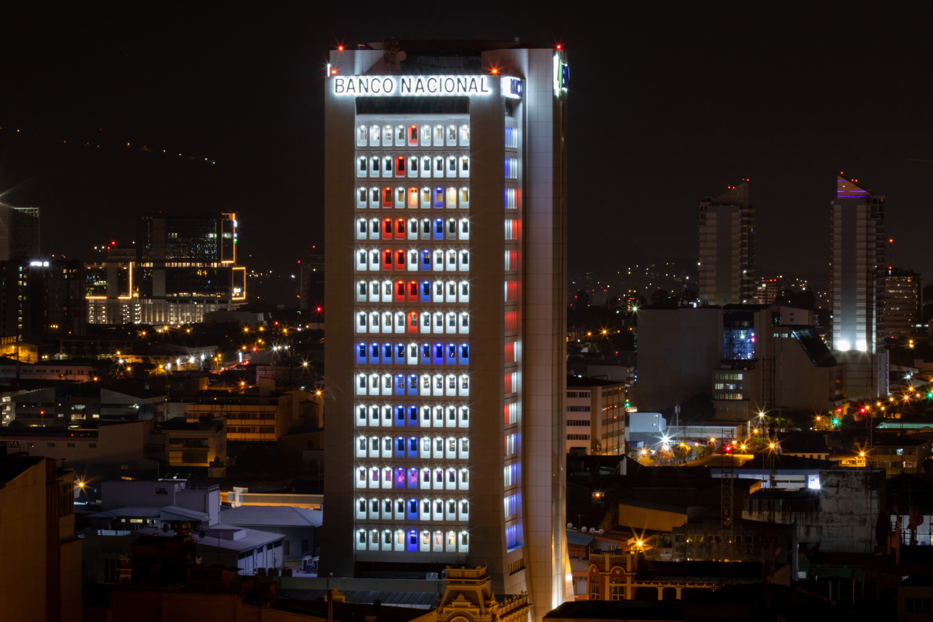 El Banco Nacional iluminó con los colores patrios los cuatro costados de su edificio principal, en San José, en conmemoración de los 200 años de la independencia del país.