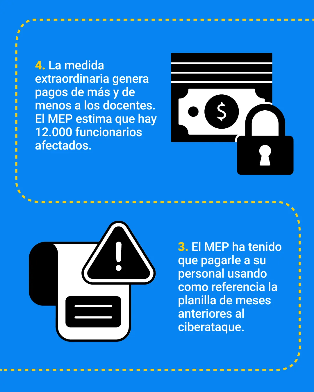 Un día antes, el MEP comunicó que otros 12.000 profesores sufren alguna afectación en su salario por la inhabilitación del sistema de pago, por ejemplo, porque no les pagan horas extras realizadas en este periodo. De esta forma, son 15.600 los funcionarios perjudicados, en una planilla de 88.000, la más grande del país, que tiene más de 100 tipos de salario.