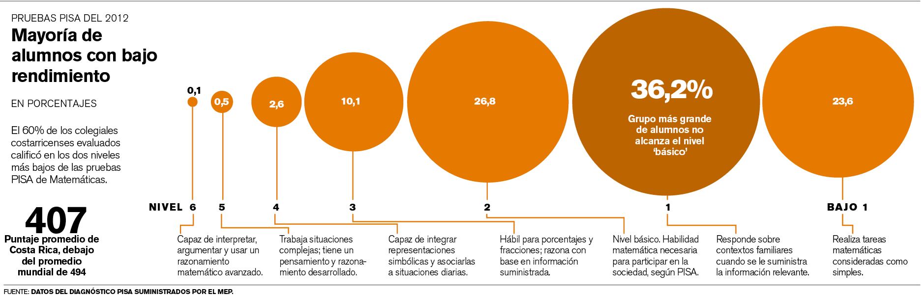 En el ranquin realizado por la Organización para la Cooperación y el Desarrollo Económicos (OCDE), entidad a cargo de las pruebas PISA, Costa Rica alcanzó el puesto 56 de 65 en cuanto a su rendimiento en Matemáticas. Por su parte, los mejores cinco puestos correspondieron a los territorios asiáticos de Shanghái, Singapur, Hong Kong, Taiwán y Corea del Sur.