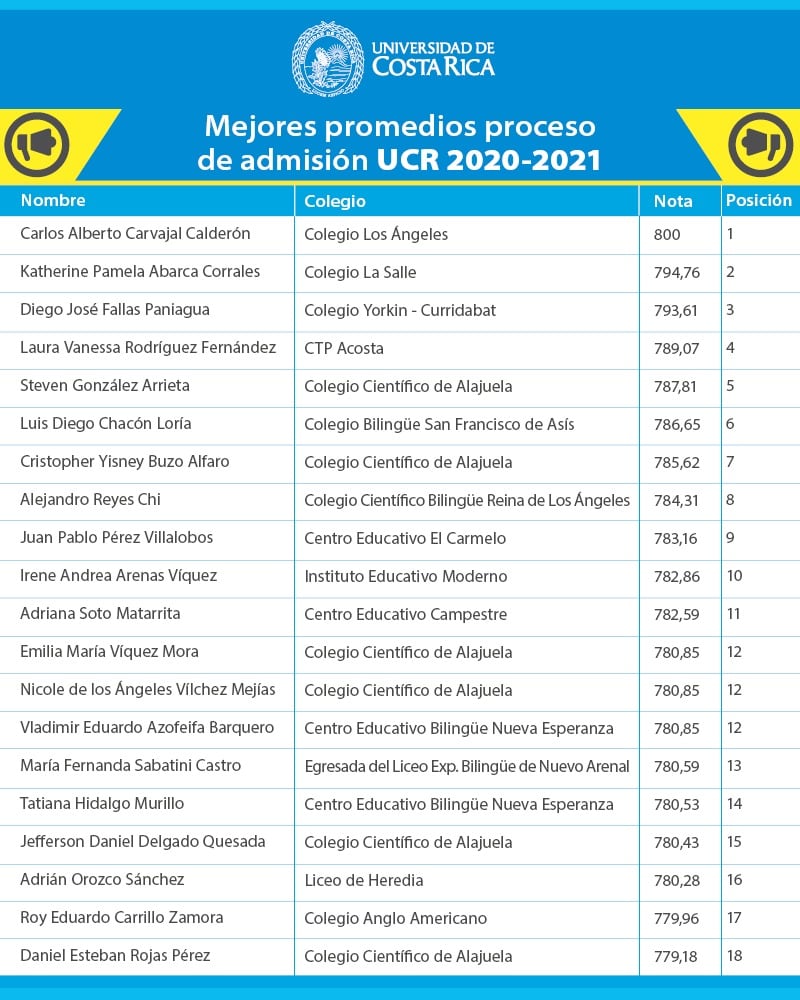 La Universidad de Costa Rica (UCR) destacó el mérito académico de 20 estudiantes que obtuvieron los mejores promedios de admisión de ingreso a ese centro de estudios para este año.