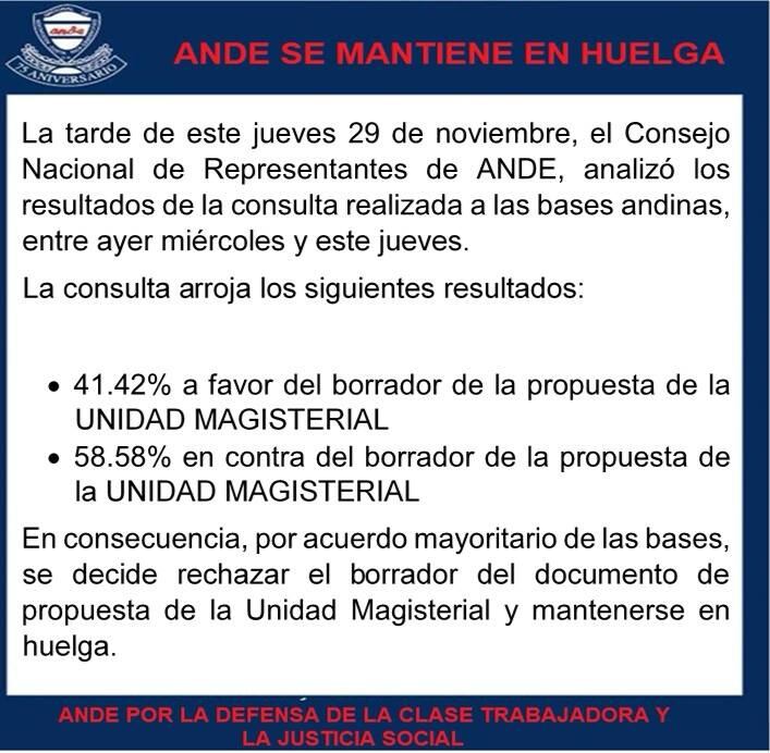 Según informó la ANDE en su página de Facebook, la votación de sus bases quedó: 41,42% a favor del borrador de la propuesta de unidad magisterial para deponer la huelga y 58,58% en contra.