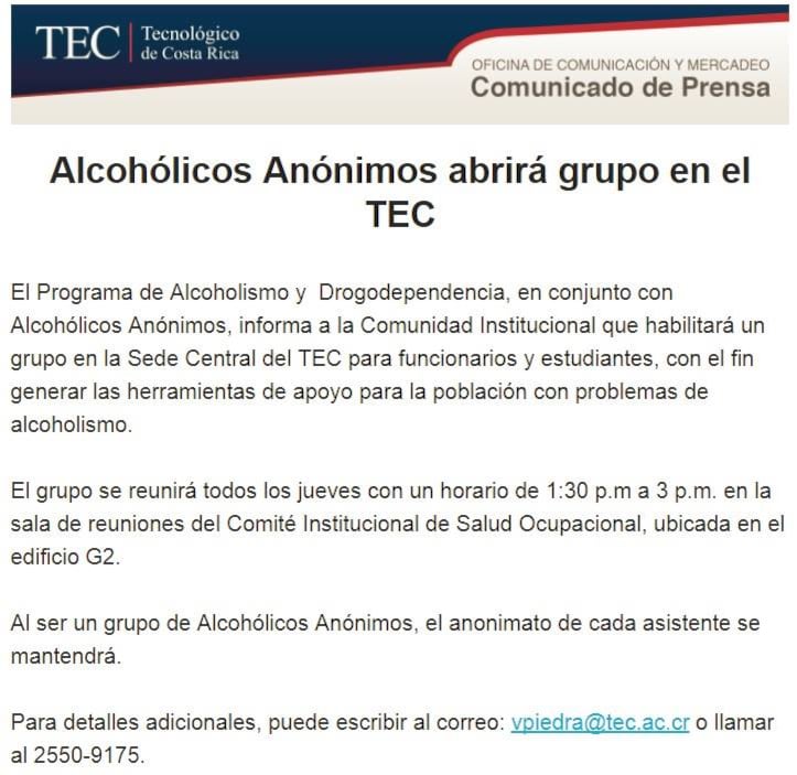 Con el fin de "generar herramientas de apoyo a la población con problemas de alcoholismo" y debido el "aumento" de casos relacionados con la adicción al alcohol y a las drogas es el que Instituto Tecnológico de Costa Rica (ITCR) abrirá un grupo de Alcohólicos Anónimos en la sede central de esa universidad, en Cartago.