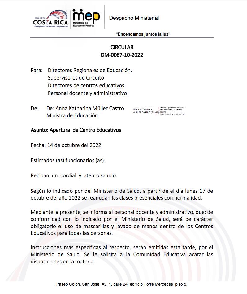 La circular DM-0067-10-2022, enviada la tarde de este 14 de octubre por la ministra de Educación, Anna Katharina Müller Castro, informó “al personal docente y administrativo, que; de conformidad con lo indicado por el Ministerio de Salud, será de carácter obligatorio el uso de mascarillas y lavado de manos dentro de los Centros Educativos para todas las personas”.
