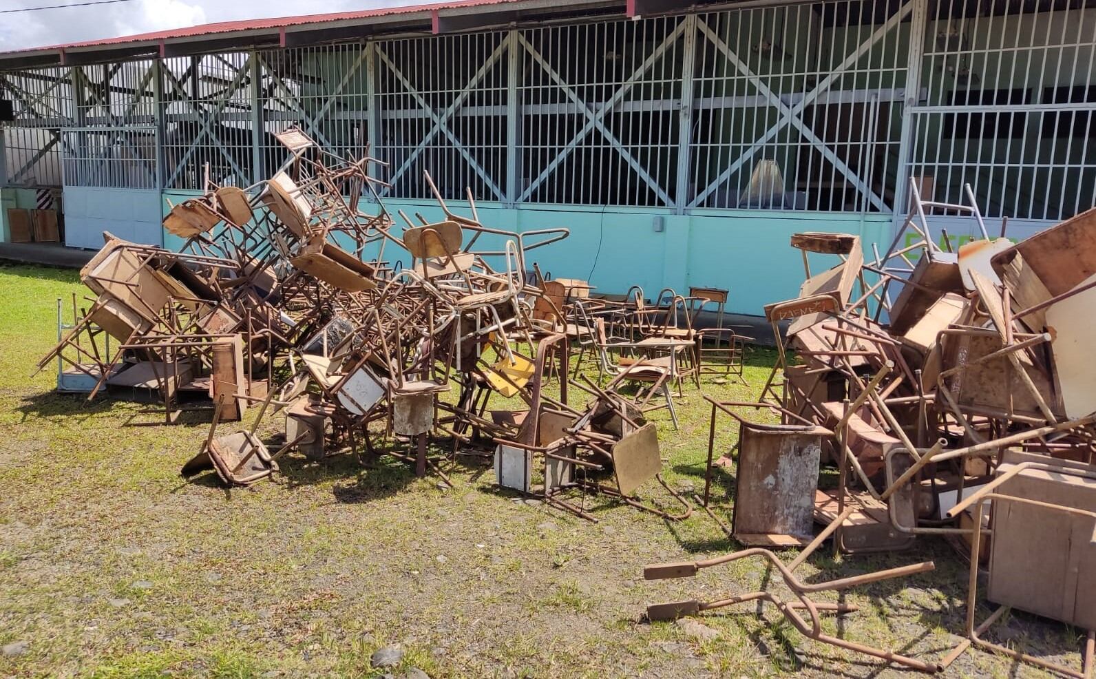 “Uno tiene que ver cómo hace porque el colegio tiene que seguir funcionando”, dijo Vega. Para la reparación de las sillas y mesas, agregó, primero se debe lijar y pintar el metal, para evitar la corrosión. Y, luego, sustituyeron las piezas de madera por un material llamado MDF Hidrófugo, que “es un poquito más caro que la madera clásica de los pupitres, pero esa no dura ni seis meses, se apolilla toda, no vale la pena. A este otro material no le entra la polilla y es resistente al agua. Es una inversión un poquito más grande pero dura más”, explicó.