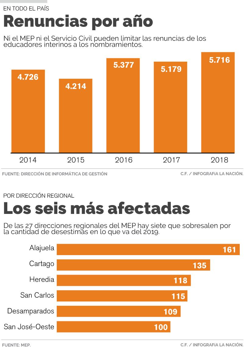 Ni el MEP, ni el Servicio Civil pueden poner límite a las desestimas. Un profesor interino puede renunciar a su nombramiento una y otra vez sin ninguna consecuencia, pues cada vez que deja un puesto, regresa a la lista de elegibles, lo vuelven a nombrar en otro centro y, si quiere, vuelve a renunciar.