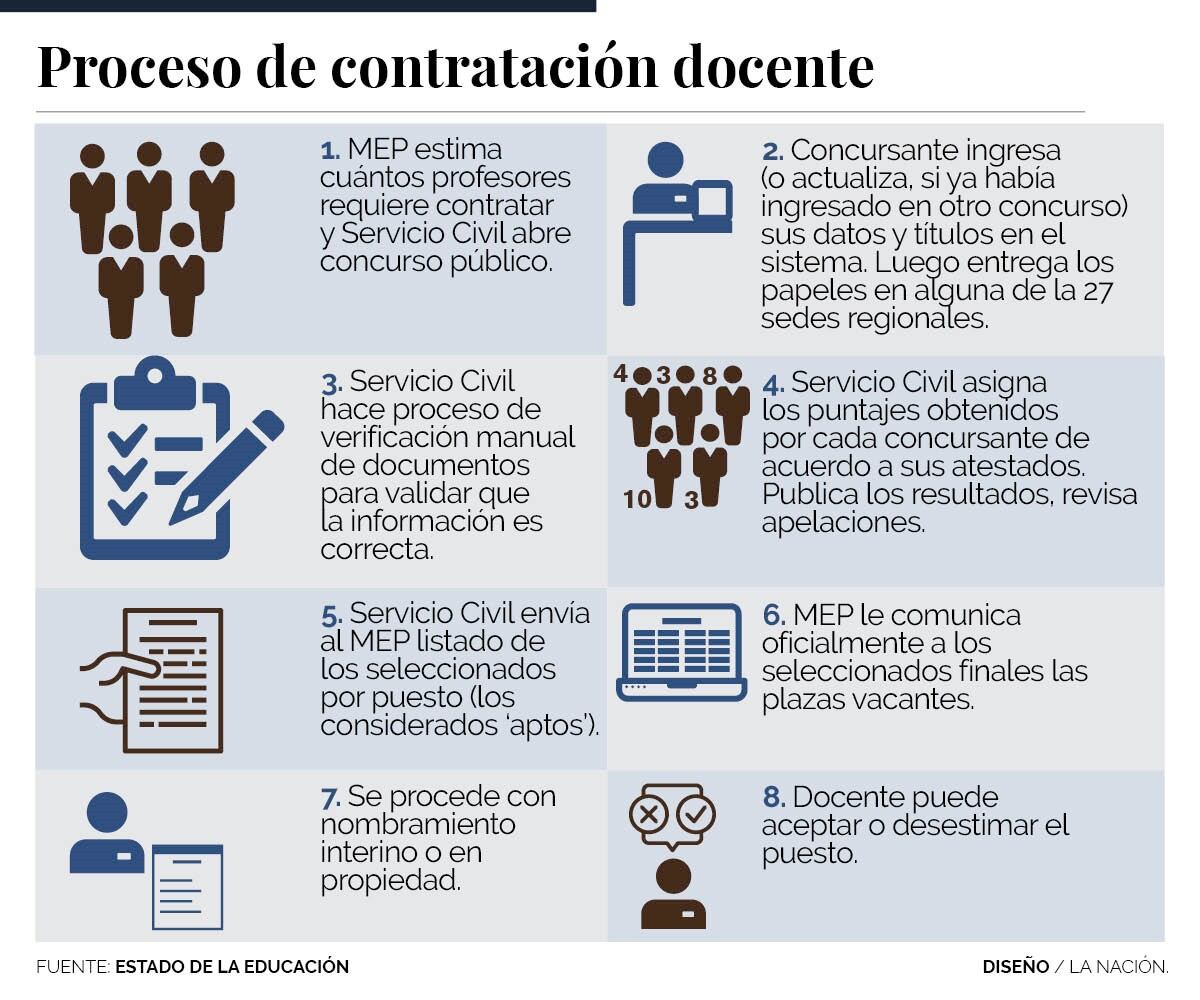 El reclutamiento está a cargo de la Dirección General del Servicio Civil que se encarga de recibir y validar los documentos de los interesados. A partir de esa información, se asignan puntajes que aumentan si el aspirante ha llevado cursos (independientemente de la relevancia de los temas respectivos) o si acumula experiencia. El que tenga más puntos es el que recomiendan al Ministerio de Educación Pública (MEP).