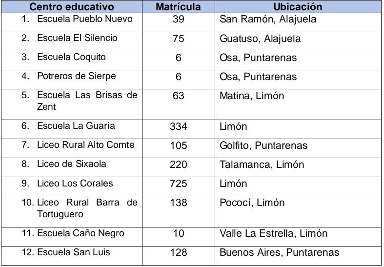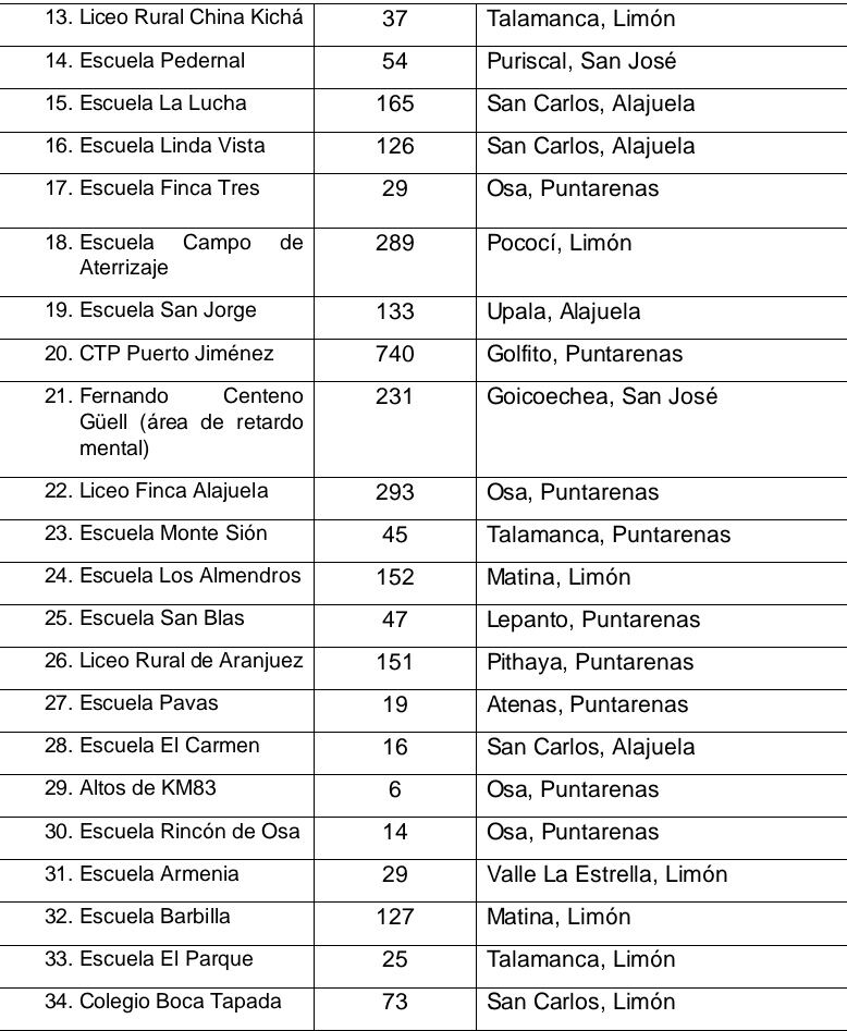 De esos centros educativos, 14 se encuentran en Limón, en comunidades como Talamanca, Valle La Estrella, Matina y Pococí; 12 pertenecen a la provincia de Puntarenas y están en los cantones de Osa, Golfito, Buenos Aires y Lepanto; ocho escuelas inhabitables se ubican en Alajuela y están en los cantones de San Carlos, Upala y Río Cuadro y dos están ubicadas en San José: Puriscal y Goicoechea. El país tiene un total de 4.783 centros educativos públicos.