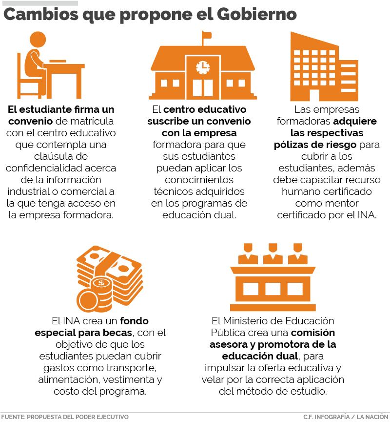 La iniciativa del Poder Ejecutivo además sustituye la creación de un órgano desconcentrado para administrar la educación dual en el país y, por el contrario, crea una instancia adscrita al Ministerio de Educación Pública, para que diseñe programas de estudios bimodales y vigile la correcta aplicación del método.