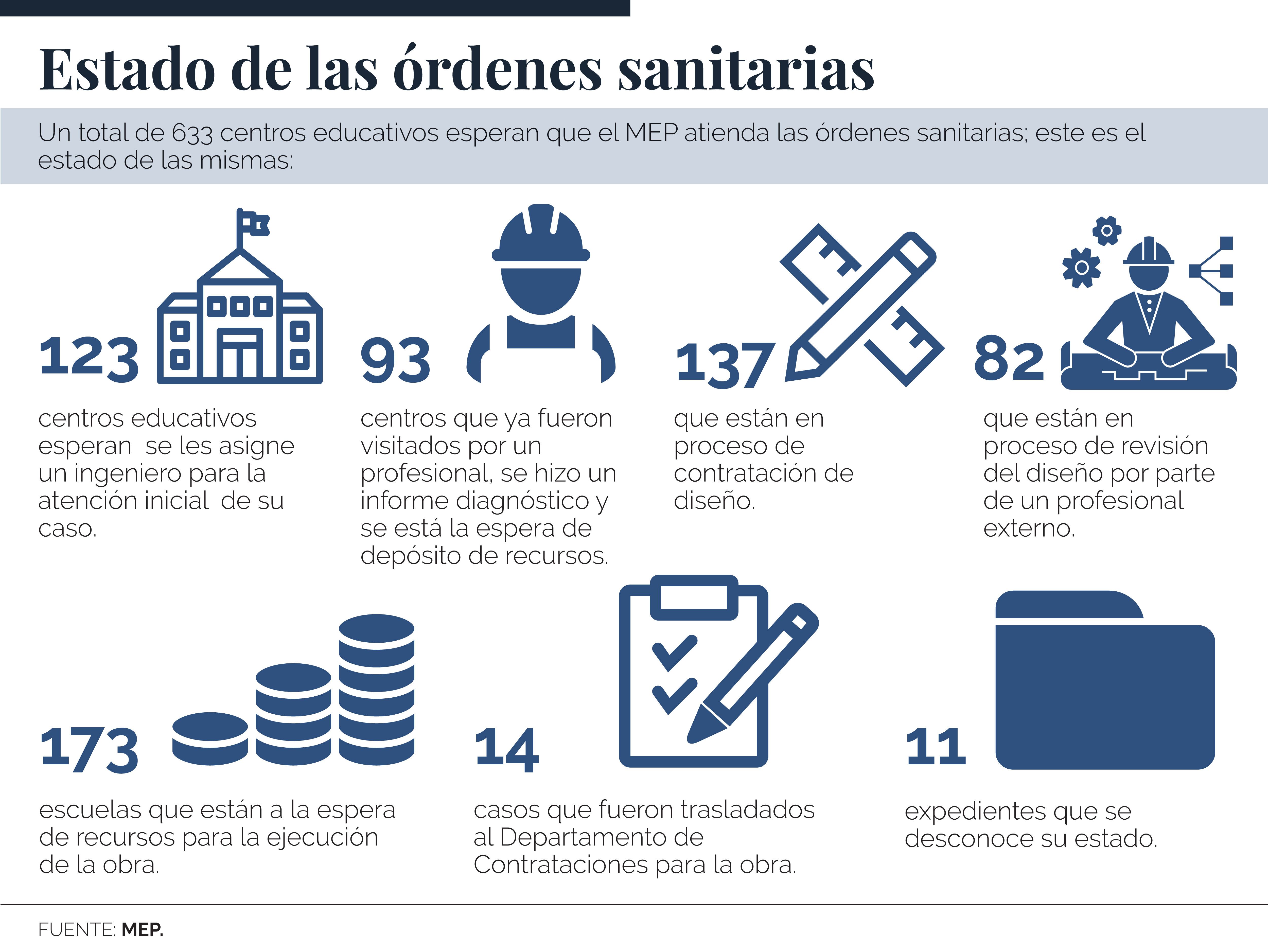 La unidad encargada de las órdenes sanitarias depuró los datos al compararlos con los del Ministerio de Salud, y determinó que en total son 633 centros educativos los que tienen esta prevención; 68 de ellos en categoría “urgente”.