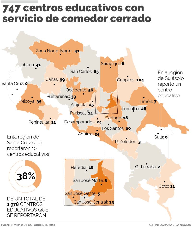 Por ejemplo, en Cañas se contabilizaban 99 comedores cerrados y en San Carlos 65, mientras que en San José había 24 centros educativos sin este servicio. En las regiones educativas Grande de Térraba en Buenos Aires de Puntarenas y Coto (que cubre Corredores y Golfito), solo se contabilizan 13.