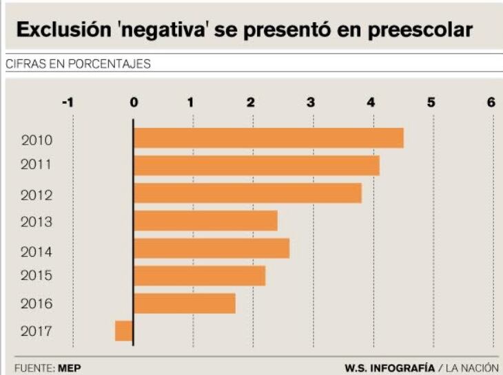 El MEP reportó en 2016 una exclusión en preescolar de 1,7%, pero, en 2017, el porcentaje fue de -0,3%, esto porque 324 chiquitos más se incorporaron a ese nivel de enseñanza luego de iniciado el curso lectivo.