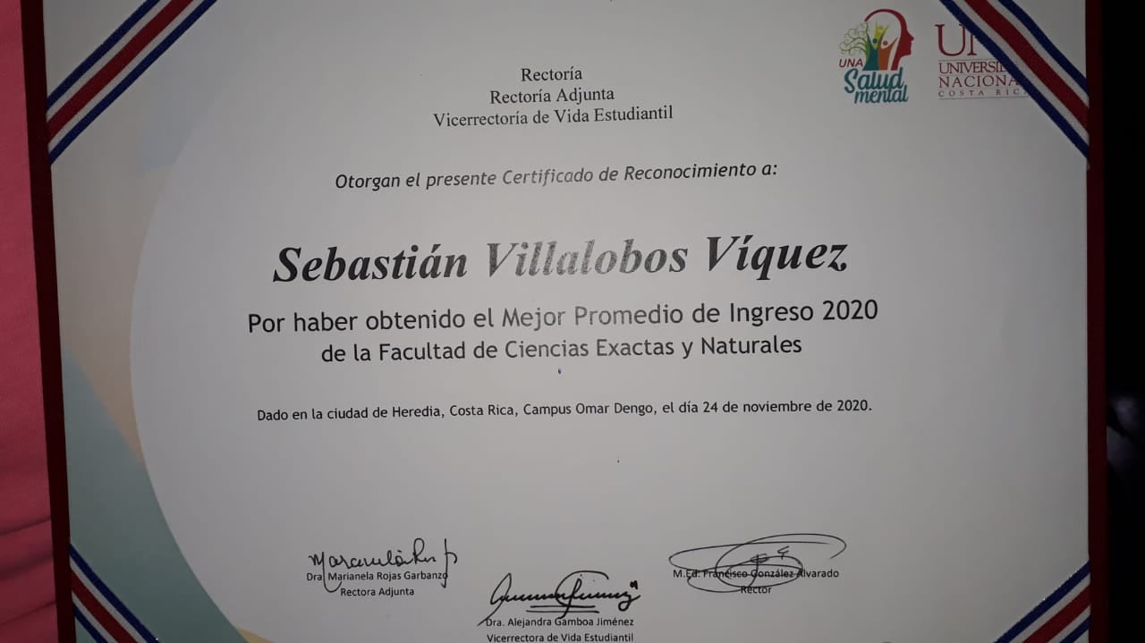 El título que recibió Sebastián Villalobos Víquez en el 2020 lo dice todo: este herediano fue el mejor promedio de ingreso a la Facultad de Ciencias Exactas y Naturales, de la Universidad Nacional (UNA), ese año.