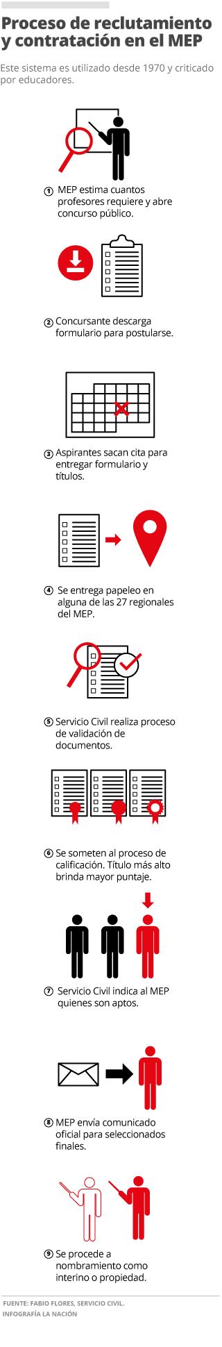 El sistema actual de reclutamiento y contratación de profesores del Ministerio de Educación Pública (MEP) sigue siendo el mismo de hace 46 años. Por esta razón se contrata personal según sus títulos académicos y no de acuerdo a la evolución que han tenido los programas de enseñanza costarricenses, ni los métodos bajo los que se trabaja.