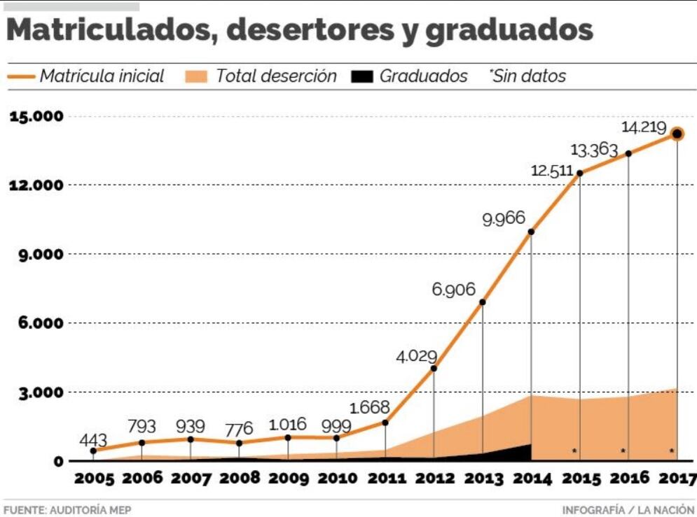 "A partir del año 2011 inicia un crecimiento en la matrícula, por el aumento en la cantidad de secciones nocturnas que iniciaron en dicho año. Asimismo, se observa que la cantidad de desertores y graduados aumentaron; sin embargo, la variable de graduados muestra un crecimiento muy lento en relación a la matrícula inicial e incluso la cantidad de estudiantes que desertaron logra triplicar aquellos que alcanzaron concluir exitosamente el programa", explica el informe 1-17 Secciones Nocturnas en CTP, dado a conocer en 2017.
