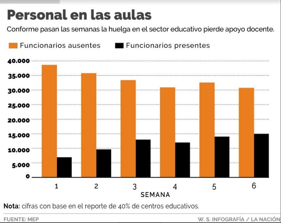 Mientras, los educadores que acudieron a las aulas en la primera semana de la huelga fueron 6.919; para la sexta semana esa cifra aumentó a 13.905. Estos datos se desprenden del 40% de centros educativos del país (unos 2.000) que son los que hacen reportes al MEP.