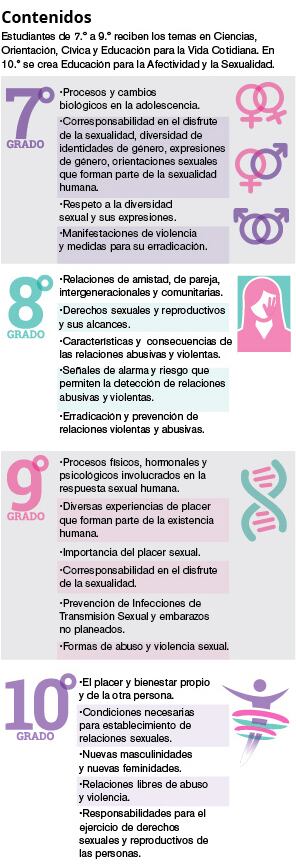 Estos programas abordarán los cambios en la adolescencia, la diversidad de identidades de género, expresiones de género y las orientaciones sexuales; el tema del placer, las medidas para la prevención y atención de la violencia (en pareja, familia, colegio, la calle, redes sociales) y el acoso callejero.