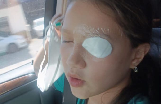 Raquel Calvo, una niña de 10 años que cursa el quinto grado de primaria, se recupera de un trauma en su ojo izquierdo luego de que un compañero de clase le pegara con una bomba plástica.