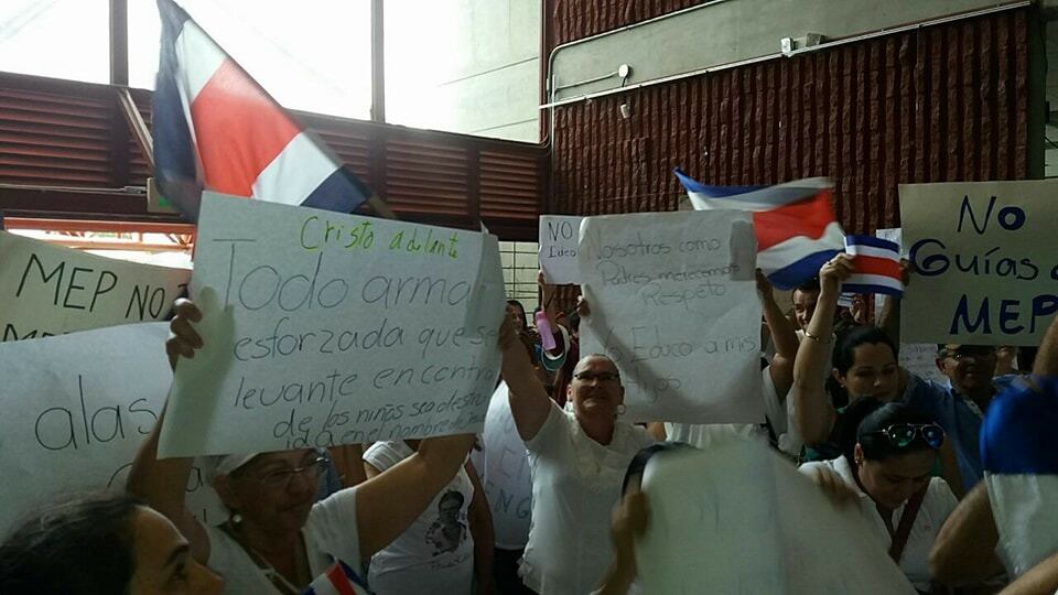 Varias decenas de hombres, mujeres, niños y jóvenes se agolparon en las afueras de la Dirección Regional del Ministerio de Educación Pública (MEP), en aquella zona, con pancartas y reclamando la presencia de la jerarca.