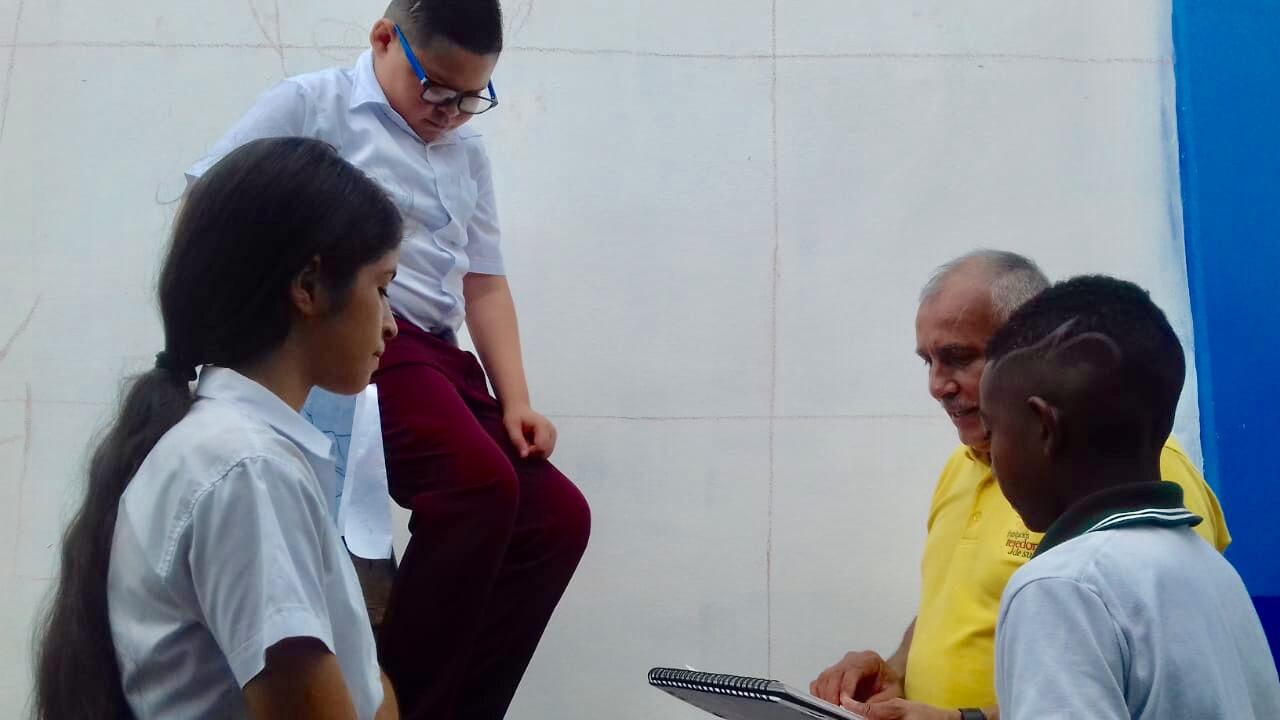 Con los mágicos trazos del pincel, tres estudiantes de colegios limonenses buscan dejar plasmado su talento en un mural que realizan con ayuda del pintor costarricense Adrián Gómez, en una escuela en Limón.