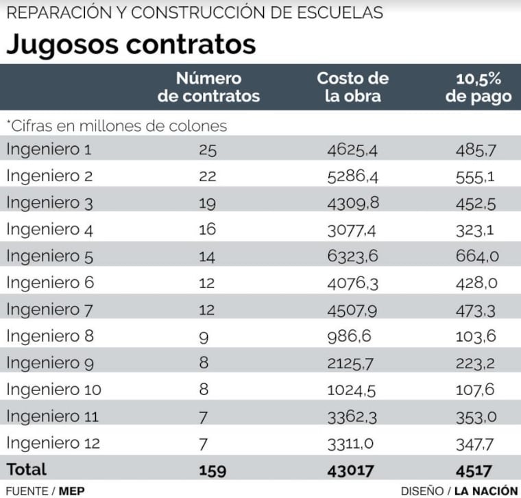 En esos años, el MEP autorizó la construcción o reparación de 517 escuelas y colegios. Estos doce ingenieros se encargaron de 159, lo que significa que, en promedio, cada uno asumió 13 contratos. El resto de los profesionales (158) se encargó de dos proyectos cada uno, en promedio, según datos suministrados por el Ministerio.