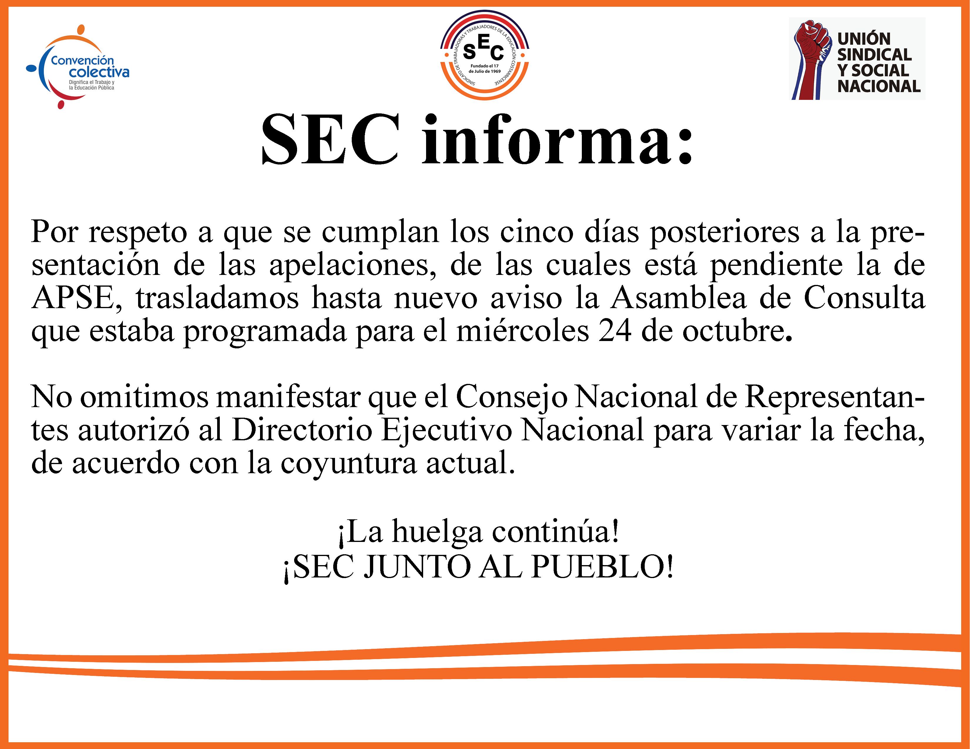 Este lunes el Sindicato de Educadores Costarricenses (SEC) también informó a su afiliación que canceló la reunión de Asamblea de Consulta que estaba prevista para el miércoles.