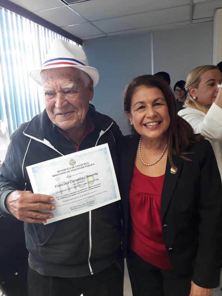 Durante la ceremonia de este lunes, la ministra Sonia Marta Mora también hizo un reconocimiento a don Francisco Carranza, ramonense que obtuvo el bachillerato a los 88 años.