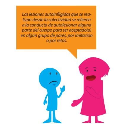 En el caso de las autolesiones, el protocolo enseña que estas pueden identificarse cuando el estudiante lo comunica de forma indirecta o directa, cuando algún compañero lo hace, o cuando la familia comunica que identificaron partes del cuerpo del estudiante con lesiones realizadas por sí mismo.