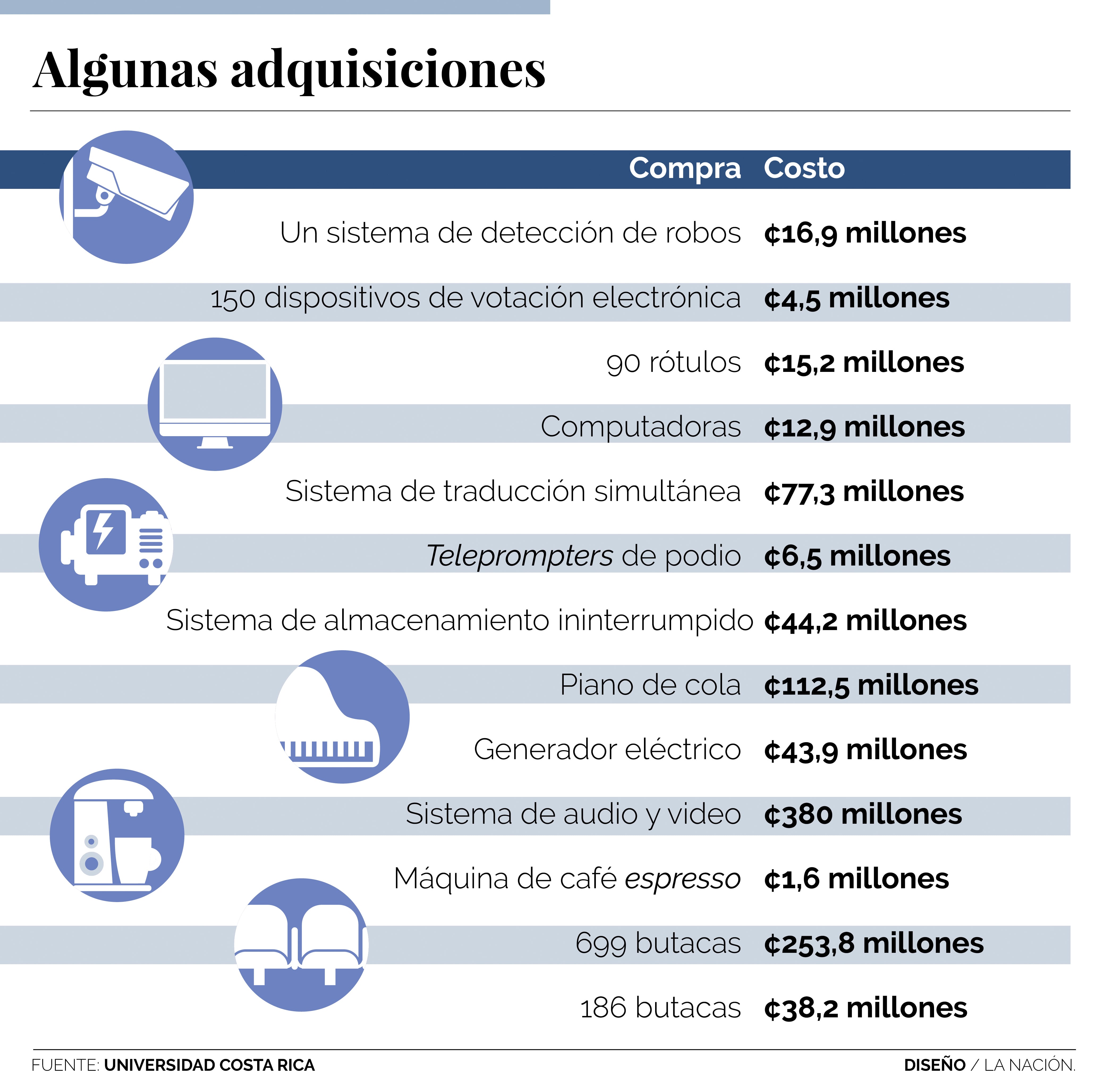 Sus 699 butacas costaron, cada una, ¢363.000. En total, la Universidad pagó ¢254 millones. También tiene 150 dispositivos de votación electrónica, sistema de traducción simultánea, telepromters y un piano de cola que costó ¢112 millones.