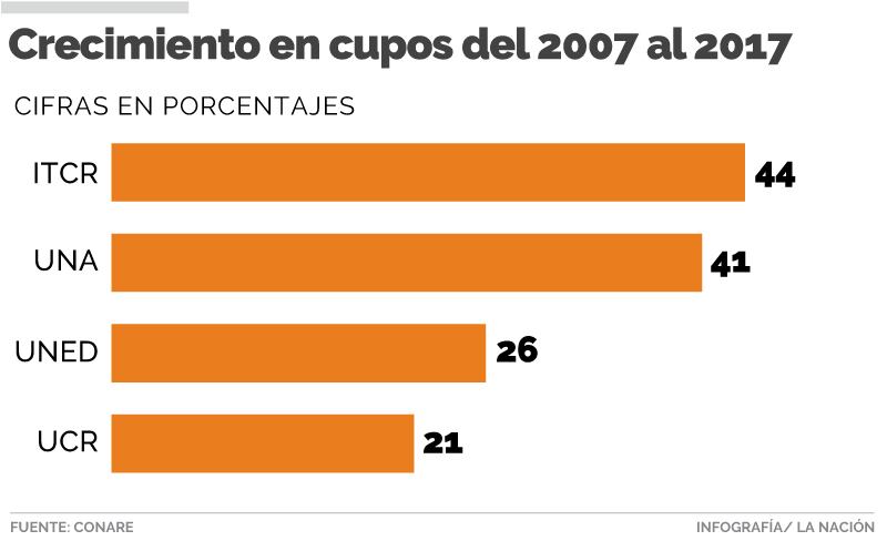 En el caso de la Universidad Nacional (UNA) en una década su matrícula se incrementó en un 41%: pasó de 13.049 alumnos a 18.390, y la Universidad Estatal a Distancia (UNED) un 26% (de 18.567 a 23.355 estudiantes desde el 2007).