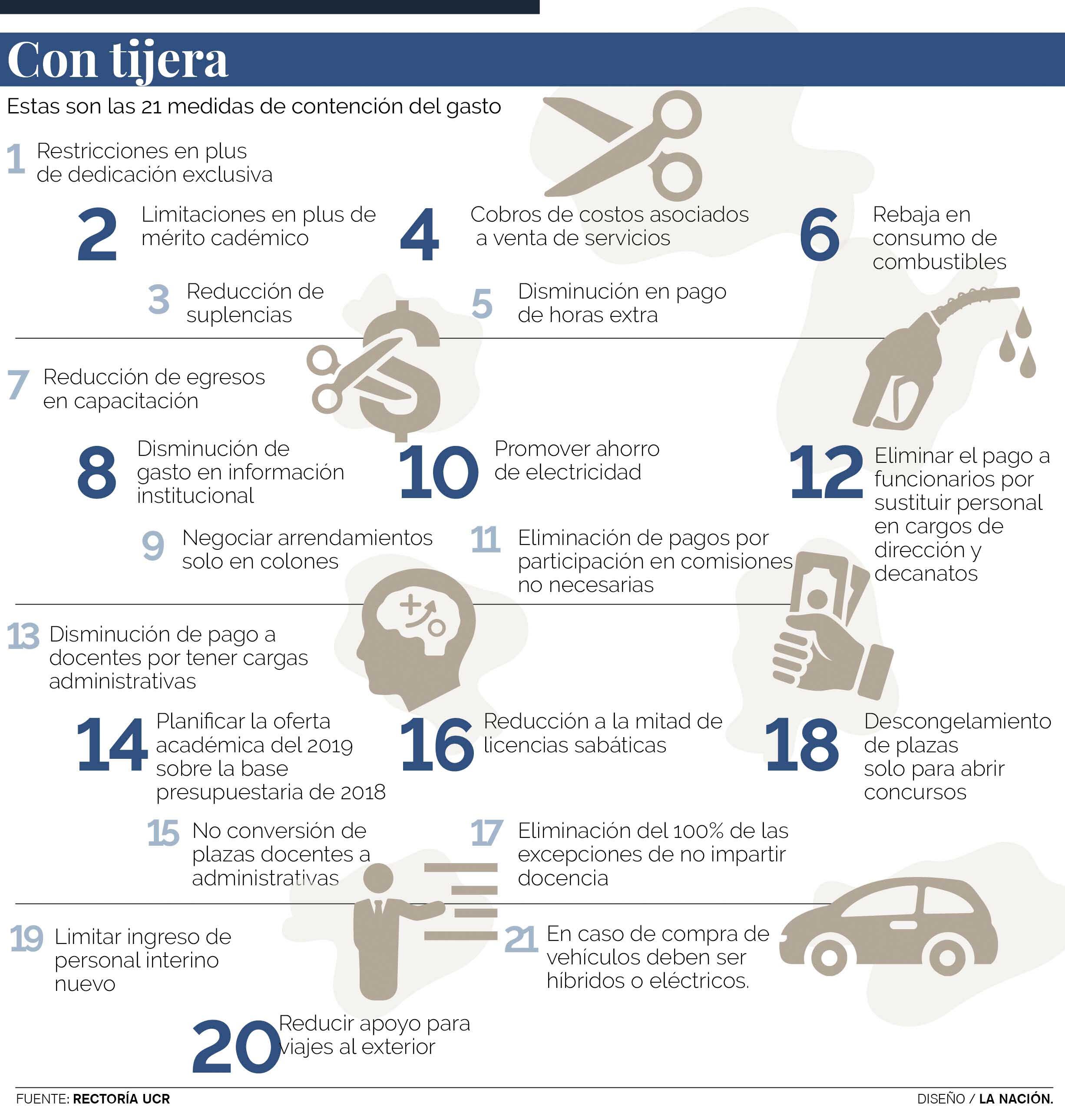 “Dadas las austeras medidas del Gobierno para prevenir una crisis fiscal que también afectan el Fondo Especial para la Educación Superior (FEES) y por ende el presupuesto de la UCR, comunicamos que la Administración se ha planteado desde ya estrategias de contención del gasto para evitar un descalabro más profundo ante la estrechez de recursos”, se lee en el oficio R-5254-2018 que el rector del UCR, Henning Jensen envió al Consejo Universitario. En esa carta le anunció las 21 medidas que implementó.