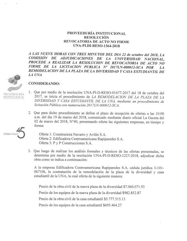 El 9 de octubre anterior, en el diario oficial La Gaceta, se informó sobre la adjudicación de dicho proyecto a la empresa Edificadora Centroamericana Rapiparedes S. A. Desde entonces, el rector de la UNA ha estado expuesto a cuestionamientos por la inversión de los fondos en un momento de contingencia económica.