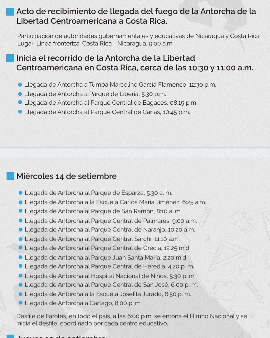 Este 13 y 14 de setiembre se realizará el recorrido presencial de la antorcha, con un trayecto primario de 378 kilómetros, que va desde el sector fronterizo de Peñas Blancas hasta Cartago. Participarán unos 20.000 alumnos, quienes tomarán el fuego para llevarlo a distintos rincones del territorio.