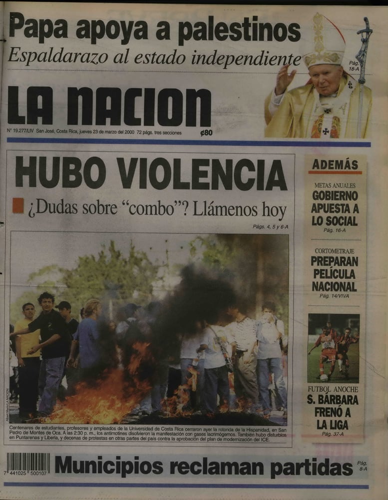 “Hubo marchas, paros laborales y bloqueos de carreteras” en todo el país, reseña el periódico La Nación del 21 de marzo del 2000, al narrar lo acontecido unas horas antes de que se aprobara el proyecto energético en primer debate, a eso de las 9:47 p. m. del día anterior.