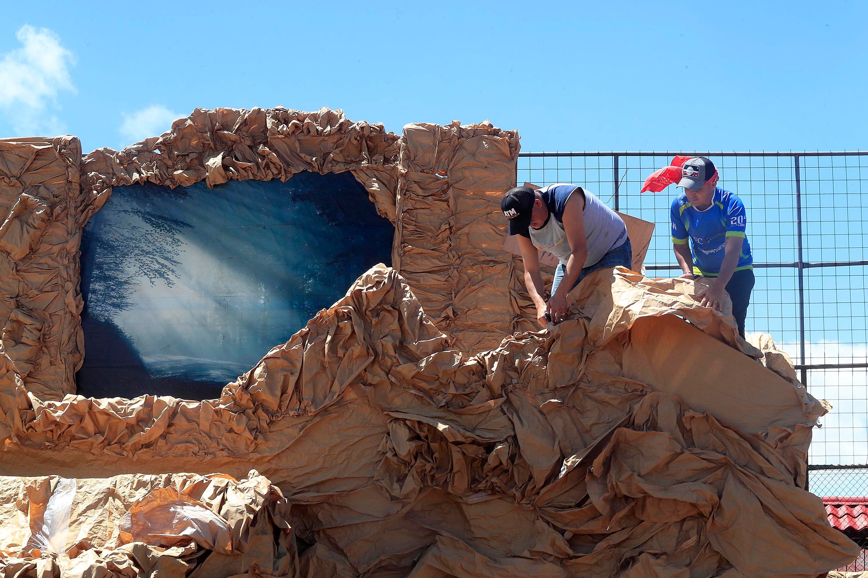 El Calvario se construye sobre una base metálica, con dos rampas, dos carretas de tráiler que dan entrada a la tropa de soldados romanos, con tarimas de madera y papel kraft.