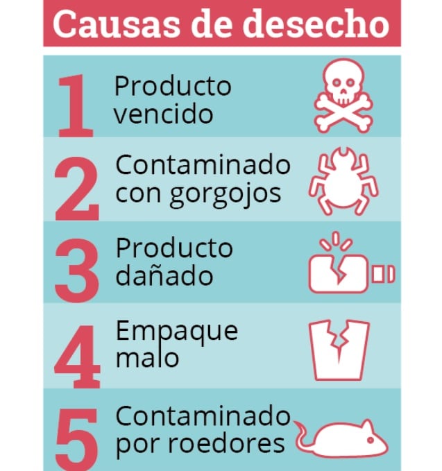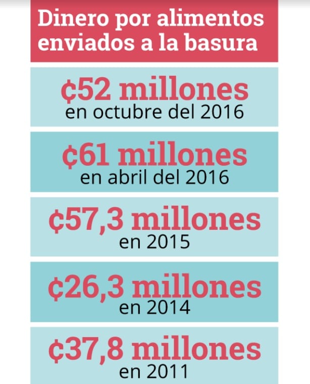 Por ejemplo, en abril del 2016 se desecharon 63.560 unidades de alimentos con un costo de ¢61,3 millones, según el informe AG312-16, publicado en diciembre del 2016. Se determinó que ¢52,7 millones de mercadería se descartaron por haber cumplido la fecha de vencimiento y por "daños provocados por mal manejo" y otros ¢6,8 millones de alimentos se tiraron por tratarse de "productos de baja calidad". Los restantes ¢1,8 millones estaban contaminados por "roedores, infestación y empaque deficiente".