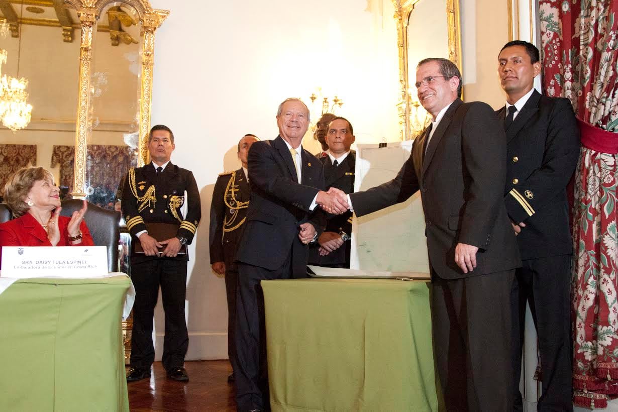 El acuerdo fue suscrito por los ministros de Relaciones Exteriores de ambos países, Enrique Castillo y Ricardo Patiño, en Quito y el mismo sienta las bases para la presentación de conjunta ante las Naciones Unidas de la propuesta de extensión de los límites de sus plataformas continentales más allá de las 200 millas marinas.