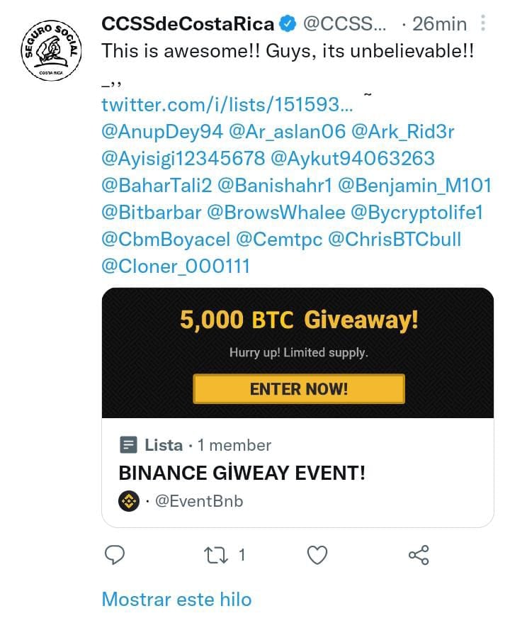 “¡Hola a todos! Pues sí, la cuenta de alguna forma la vulneraron y publicaron contenido que no era nuestro. Por dicha no perdimos acceso y ya cambiamos las claves. Igualmente estaremos atentos a lo que suceda”, publicó la CCSS en su perfil a las 7:27 a. m.