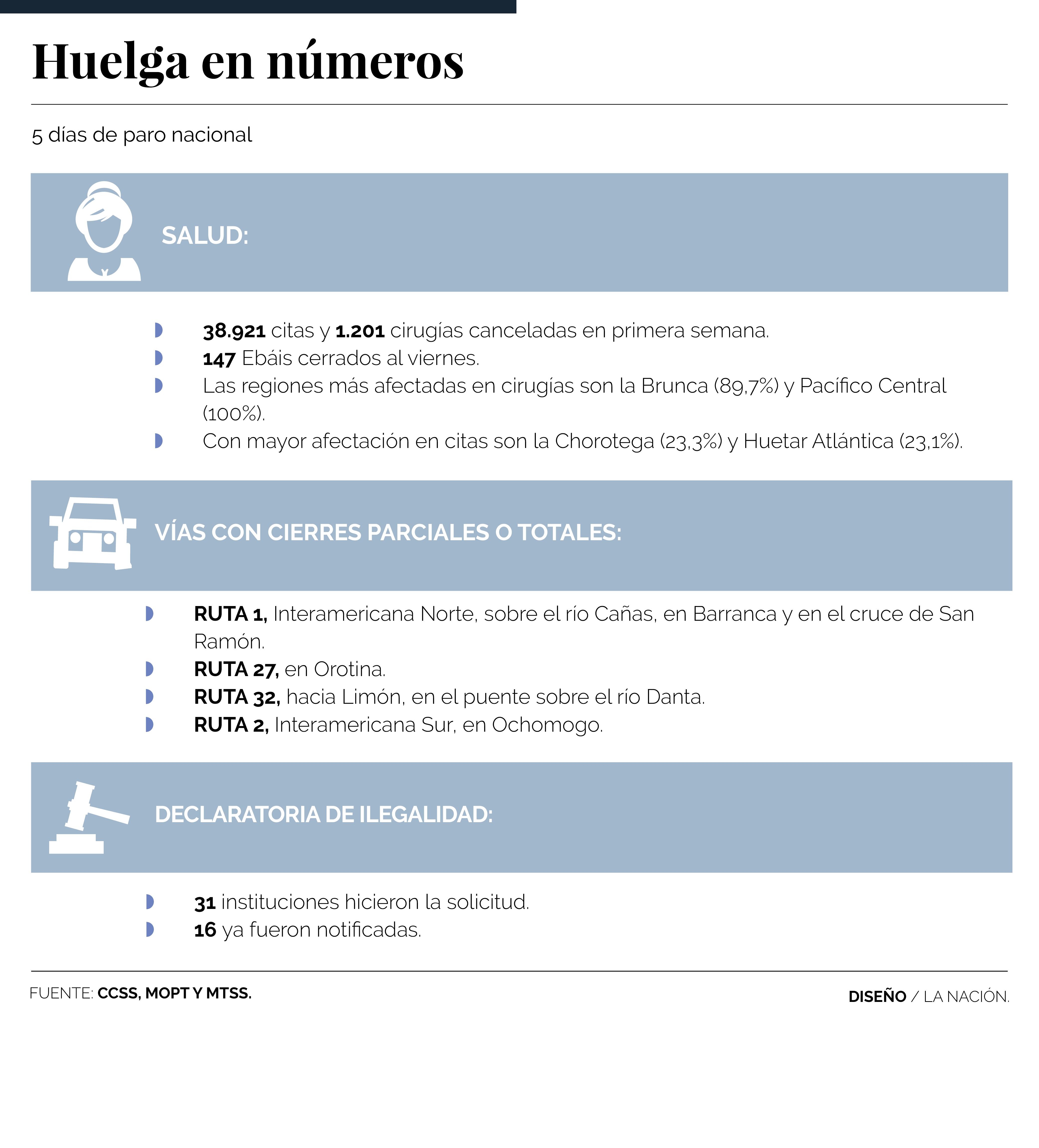 La primera semana de paro dejó como saldo 38.921 citas y 1.201 cirugías suspendidas en los hospitales de la Caja Costarricense de Seguro Social (CCSS). Cierres parciales o totales en vías de gran importancia como la ruta 1, Interamericana Norte, y la ruta 2, Interamericana Sur, a la altura de Ochomogo.