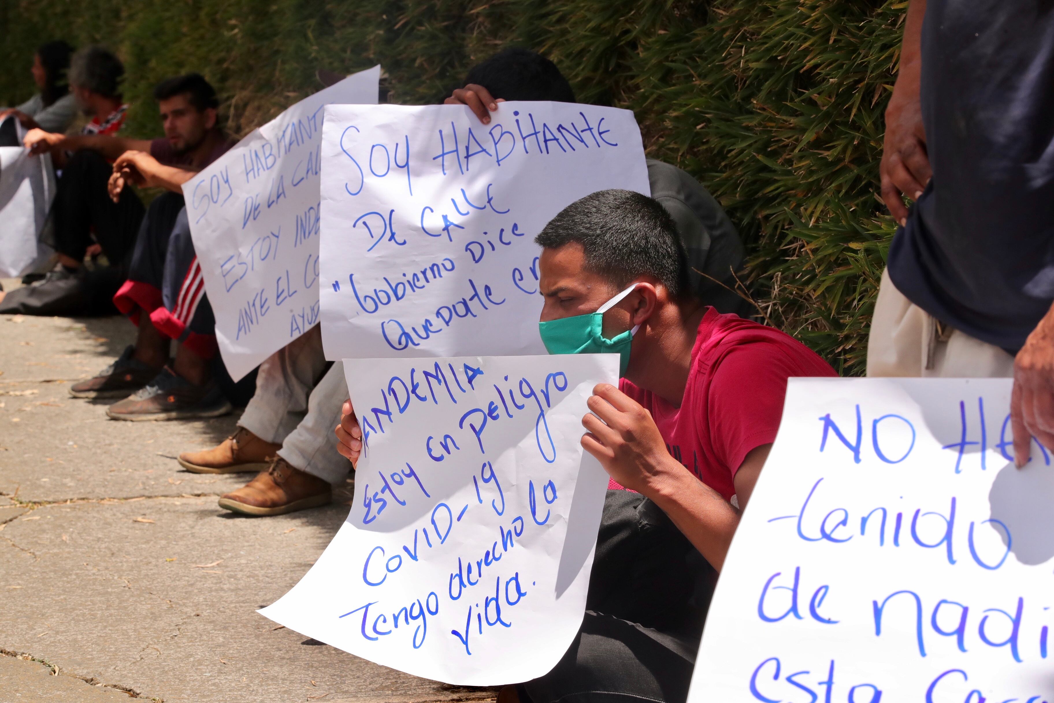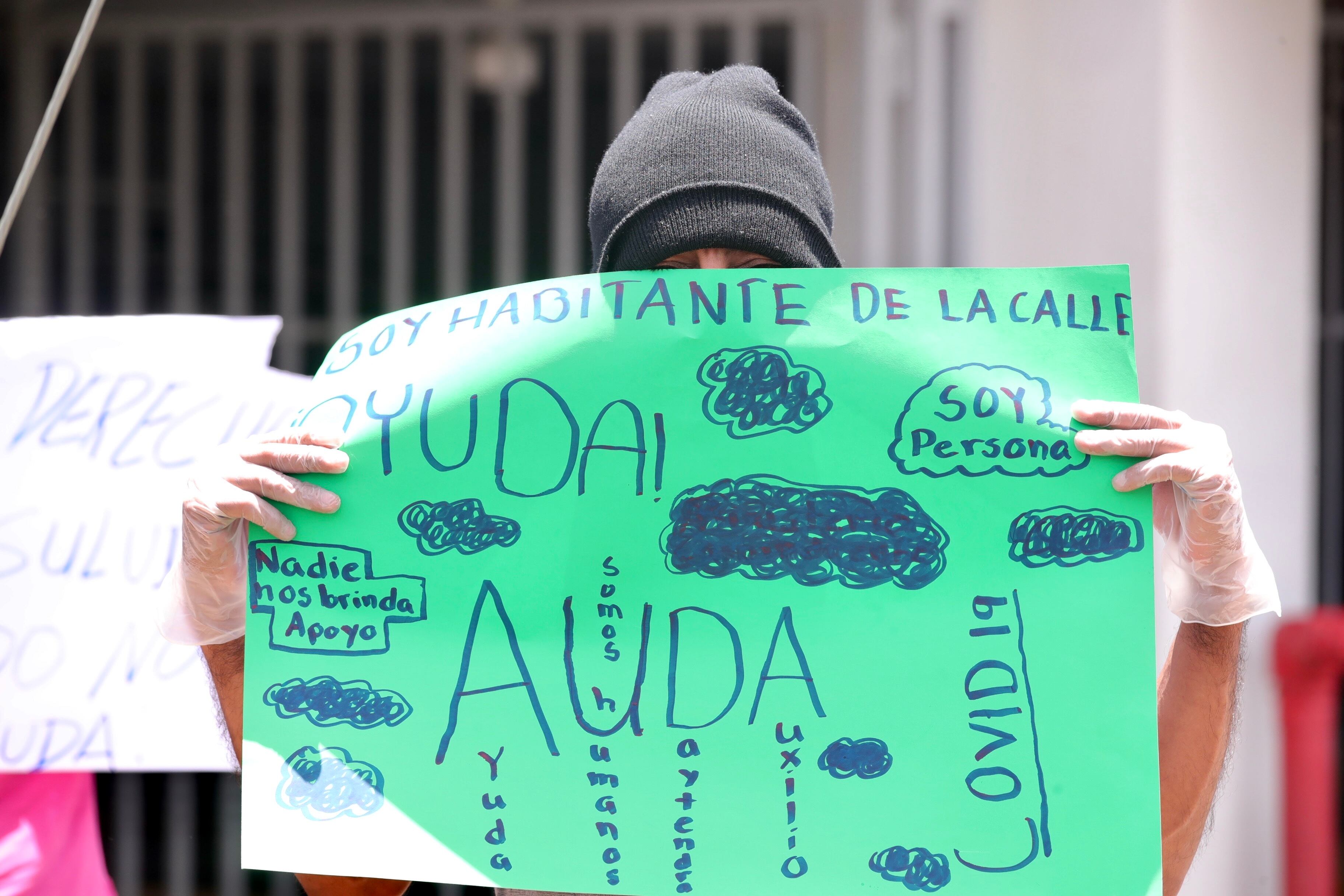 Varios de los indigentes que acudieron a Casa Presidencial portaban carteles que decían: “El Gobierno dice: ‘Quedate en casa’. No tengo casa”, o “Vivo en la calle. No tengo dónde ir cuando dicen ‘Quedate en casa’”.