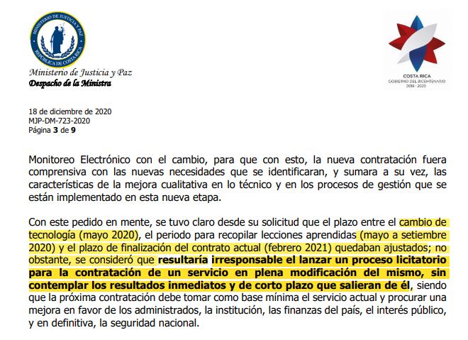 “Lo que le puedo decir es que cuando salí del Ministerio de Justicia llevábamos cinco meses trabajando en la confección del cartel de licitación; mis instrucciones eran que estuviera listo para marzo de 2020 porque era una prioridad que se atiempara el proceso de licitación con el vencimiento del contrato en febrero de 2021″.