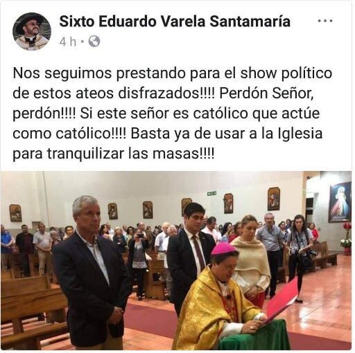"Nos seguimos prestando para el show político de estos ateos disfrazados. Perdón Señor, perdón. Si este señor es católico que actúe como católico. Basta ya de usar la Iglesia para tranquilizar masas", dijo Varela en una publicación en su perfil personal de Facebook.
