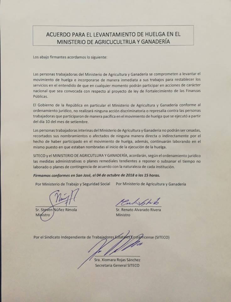 El convenio, titulado “Acuerdo para levantamiento de huelga” lo firmó Xiomara Rojas Sánchez, secretaria general del Sindicato Independiente de Trabajadores Estatales Costarricenses (Siteco), según los documentos que dio a conocer el Ministerio de Trabajo.
