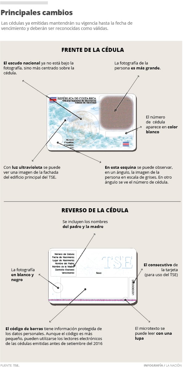 Entre los cambios que incluye este nuevo formato se encuentran que la fotografía de la esquina superior derecha será más grande y tendrá dentro el número de cédula. Además, en el extremo inferior izquierdo se sustituirá la foto disminuida de la persona por una imagen cambiante en láser, en la que se podrá apreciar la foto o el número de cédula según la posición en la que se coloque.