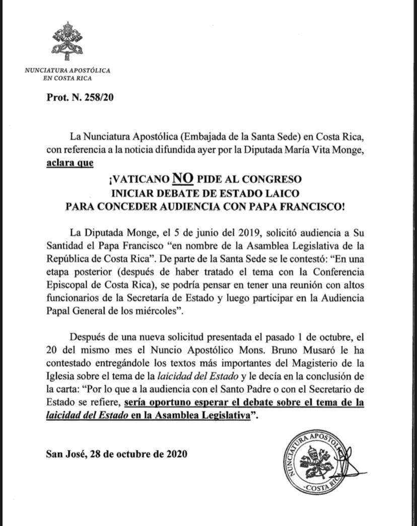 La Nunciatura Apostólica en Costa Rica desmintió un comentario difundido en redes sociales por la diputada María Vita Monge, del Partido Unidad Social Cristiana (PUSC), quien este martes aseguró que el Vaticano había solicitado dar inicio a las discusiones del proyecto sobre el Estado laico.