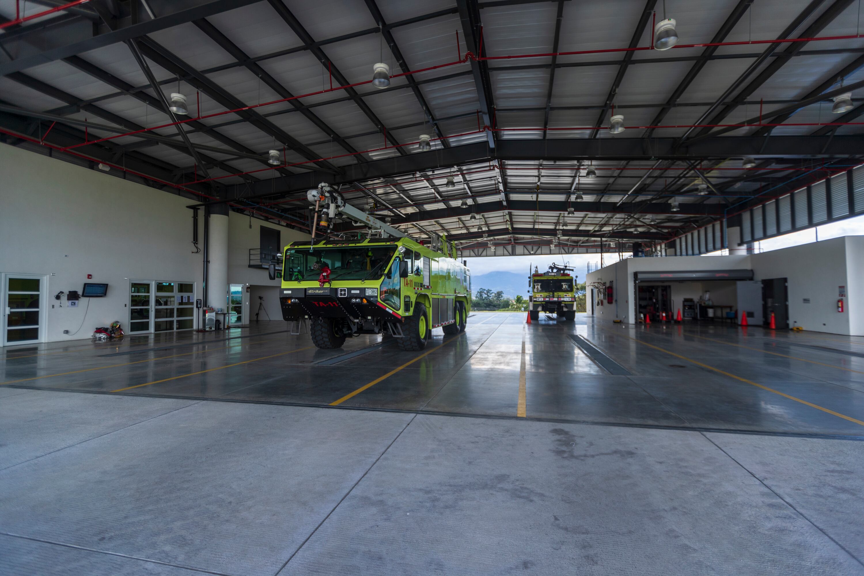 La edificación contempla hasta siete bahías techadas para el estacionamiento de camiones, además se consideraron las dimensiones para equipos de mayor tamaño, en caso de que el Cuerpo de Bomberos adquiera otras unidades con características superiores a las actuales. El complejo, además, dispone de una torre de observación que cubre todo el campo aéreo.