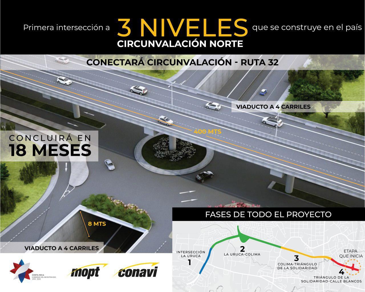 En el nivel más bajo de toda la estructura estará la vía que conduce a Limón, en el siguiente nivel se construirá la rotonda que permitirá enlazar a los vecinos de Calle Blancos, en Goicoechea y Llorente de Tibás hacia la ruta 32 y en el tercer piso estará el viaducto que une a La Uruca con Calle Blancos.