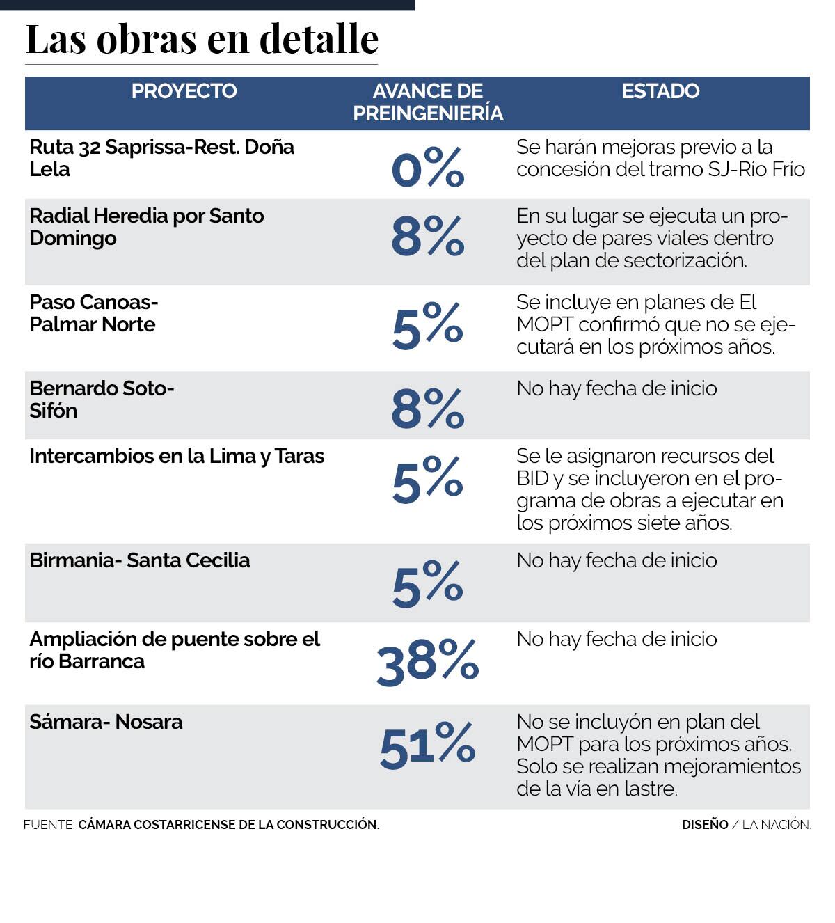 En un análisis de la Cámara Costarricense de la Construcción, se incluyó dentro de esa dependencia del Ministerio de Obras Públicas y Transportes (MOPT) ocho proyectos, de los cuales dos tienen entre un 30% y 50% de las etapas previas cumplidas, mientras que en los restantes el avance ronda entre el 8% y el 5%.
