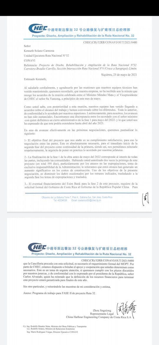 En el documento, firmado por el representante legal de CHEC, Zhou Jingxion, se indica que para la segunda fase es necesario que el Gobierno de Costa Rica haga una solicitud formal de financiamiento al Gobierno de la República Popular China.
